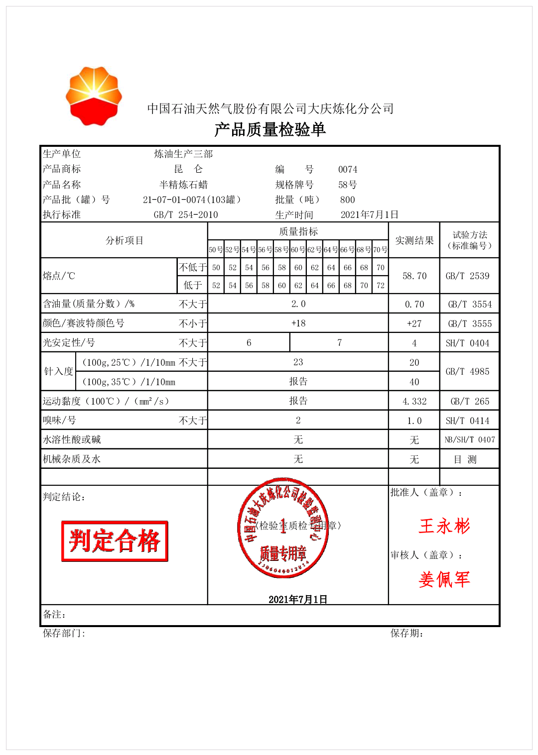 Daqing Refining and chemical Semi-Refined Paraffin Wax 58#packaging diagram,quality inspection report