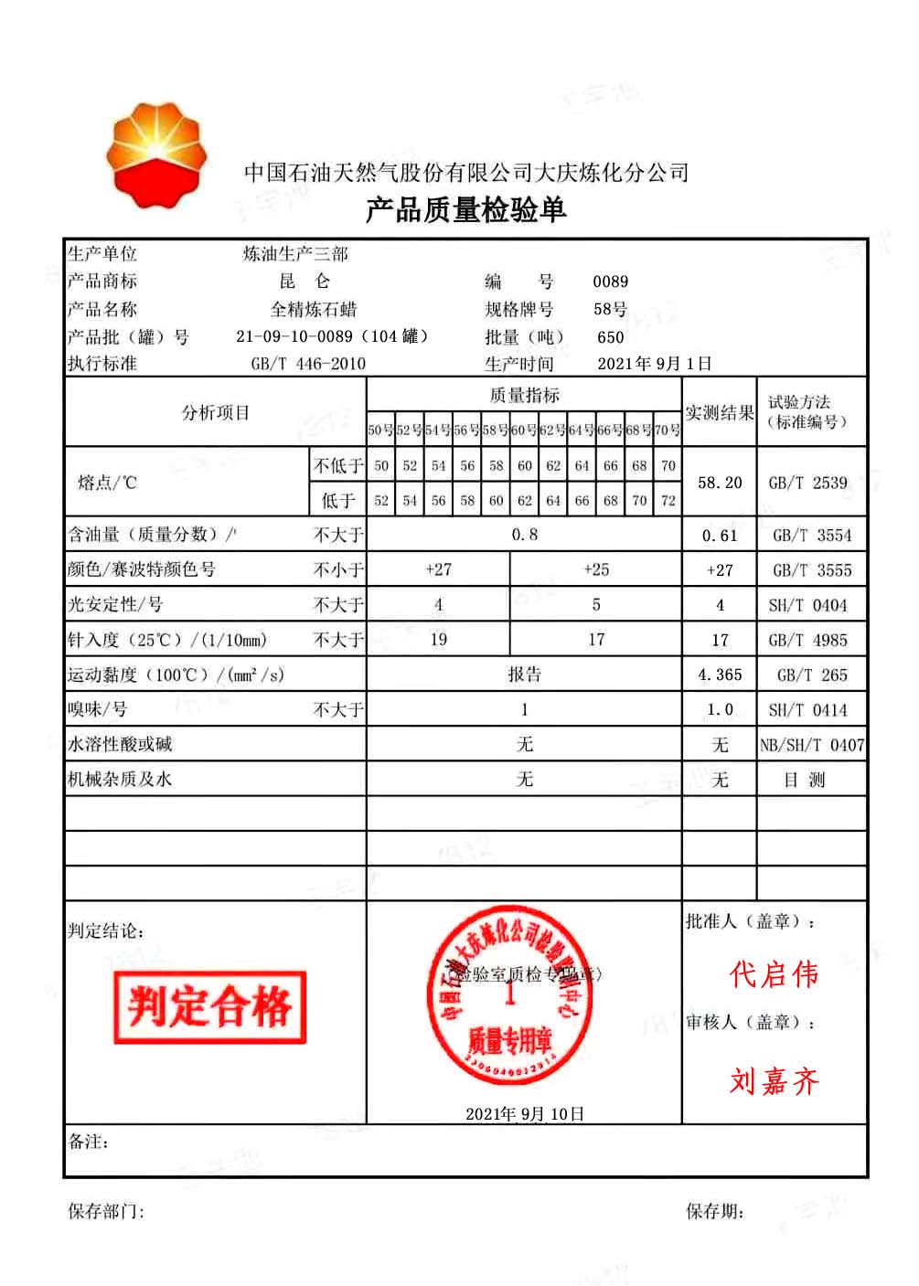 Daqing Refining and chemical Fully-Refined Paraffin Wax 58#packaging diagram,quality inspection report