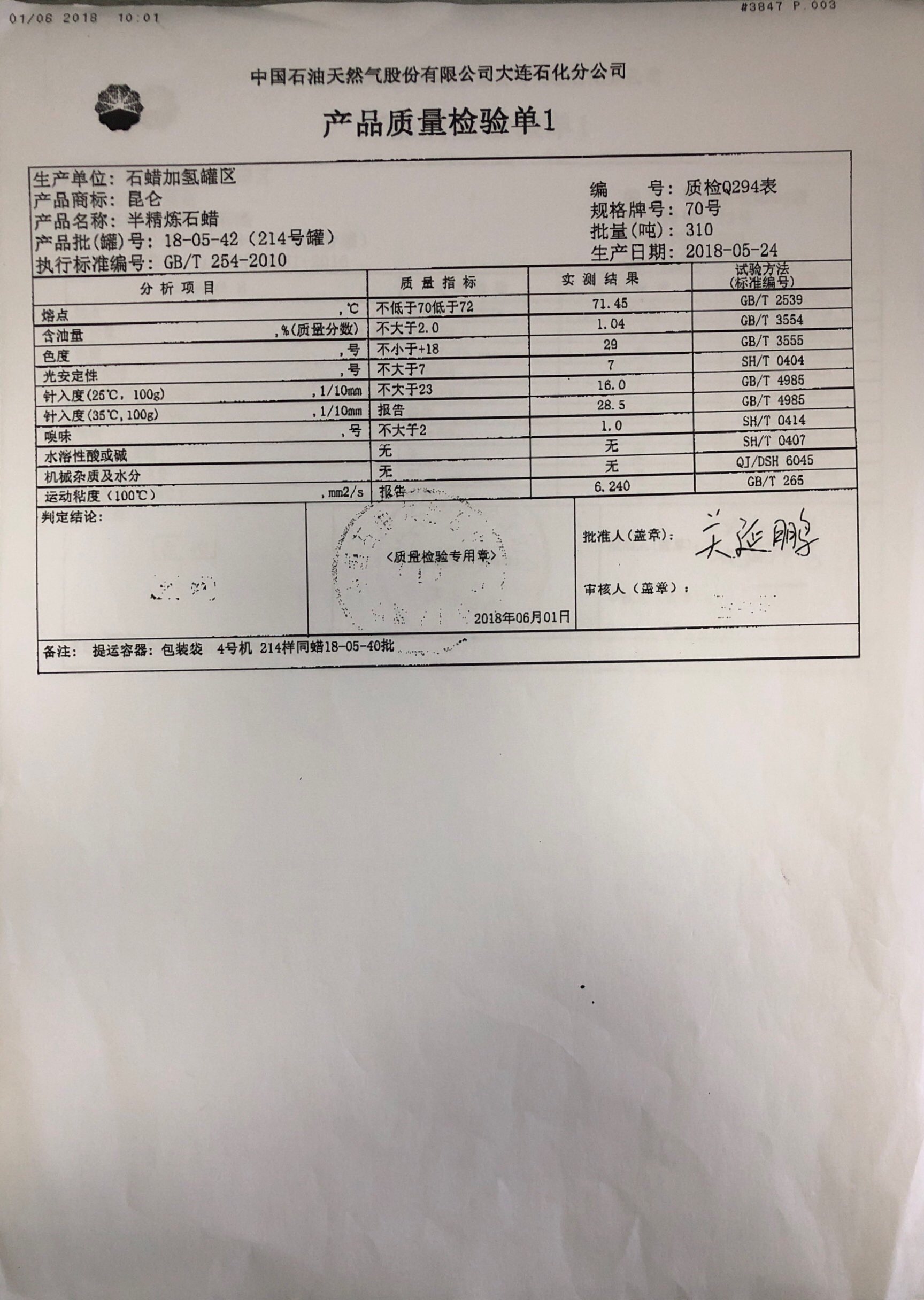 Dalian Semi-Refined Paraffin Wax 70#packaging diagram,quality inspection report