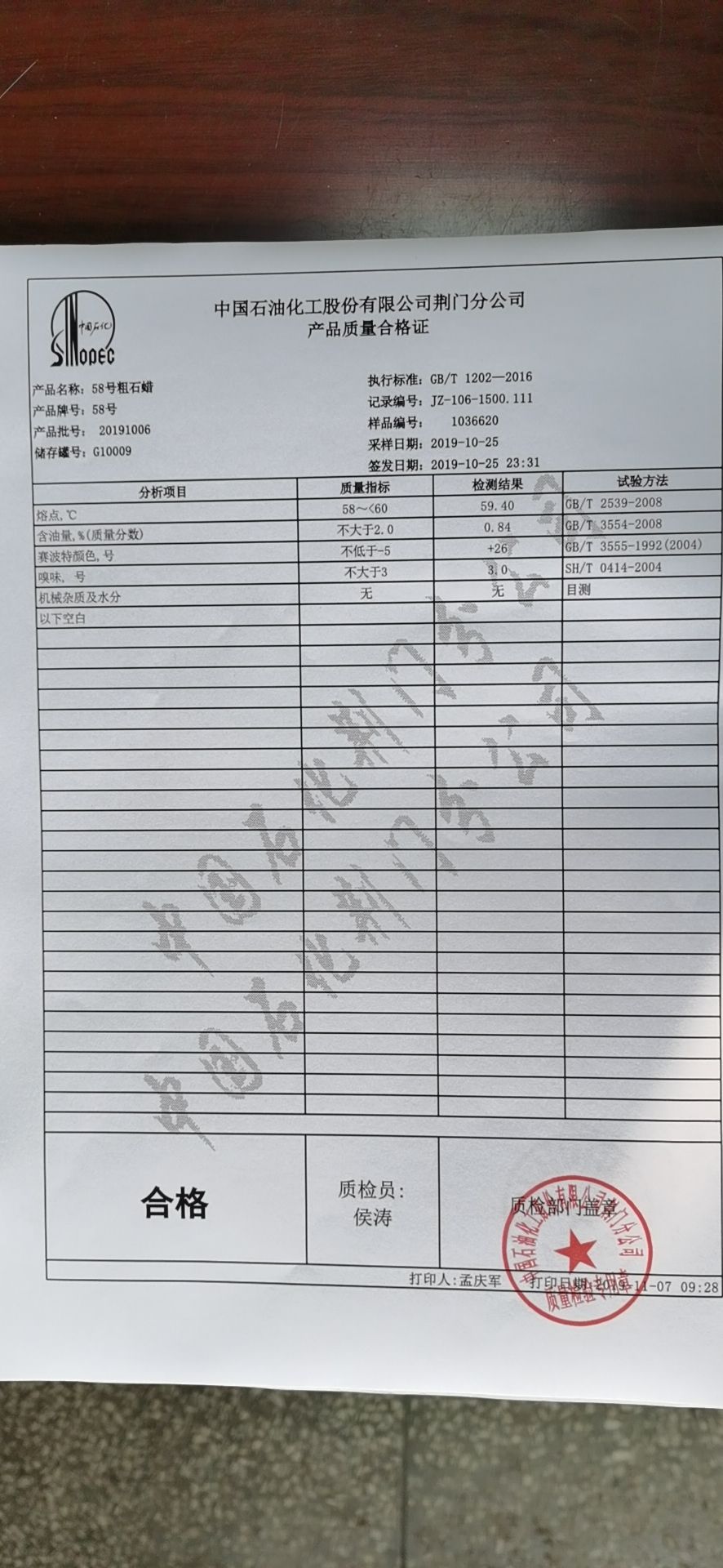 Jingmen Crude Paraffin Wax 58#sample drawing,quality inspection report